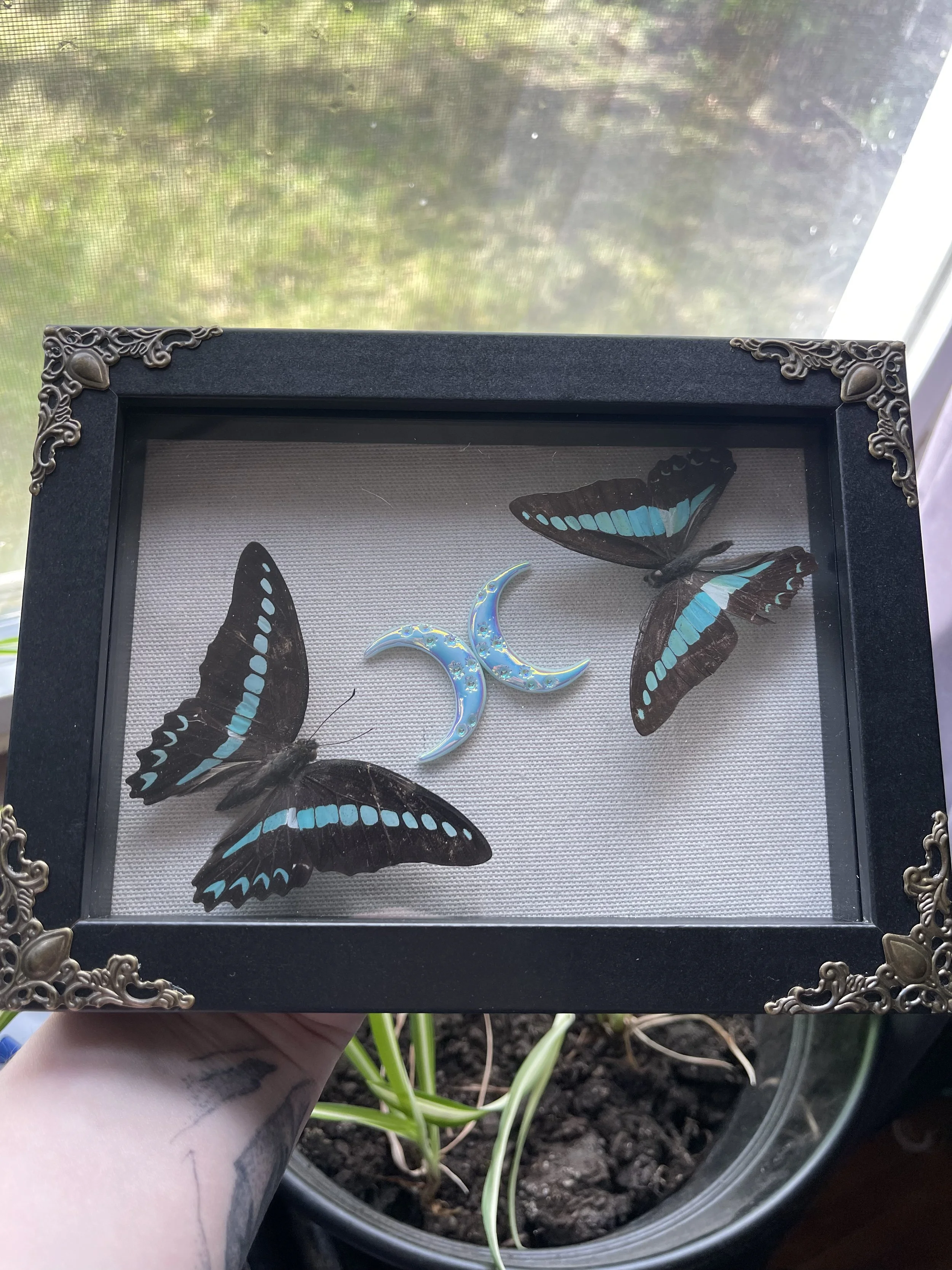 Shop › Blue Bottle Butterflies Image 1 of 1 Blue Bottle Butterflies $60.00 Two blue bottle butterflies in a 5x7 shadow box frame with moon decor Add To Cart Added! Two blue bottle butterflies in a 5x7 shadow box frame with moon decor